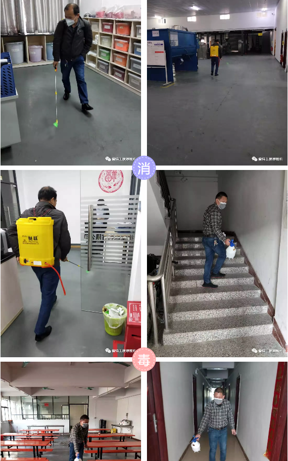 公司安排專人專職每天進行兩次消毒,用84消毒液對辦公區域、生產車間、飯堂、宿舍等公司全范圍覆蓋消毒。宿舍人員每人發放一瓶75°酒精每天自行消毒。