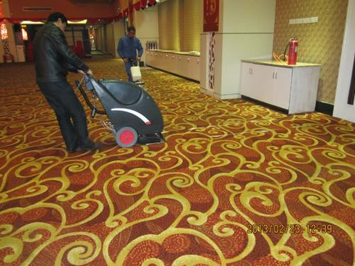 雙干泡沫地毯清洗 使用工具:單盤擦刷地毯,并用泡沫機打,梳或耙地毯,吸塵器。 使用材料:高泡地毯清洗劑。