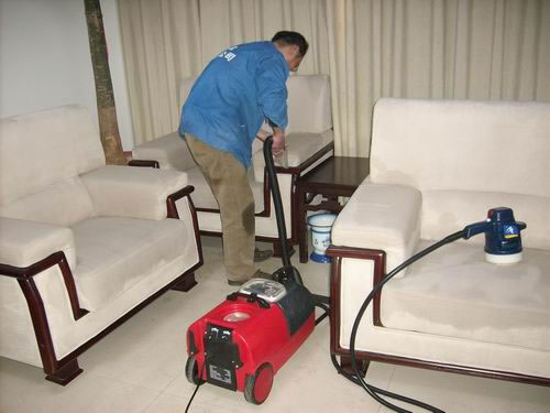 當清潔劑噴在沙發上一刻鐘左右用蒸汽機對沙發表面進行加熱,然后用干泡清洗機對沙發表面進行清潔。