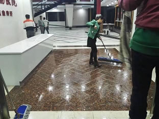 3、拖洗地板開始前先放好"地板未干"告示牌,然后從水源方向拖洗。